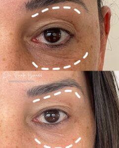 O preenchimento é realizado com ácido hialurônico, esse tratamento é feito em regiões profundas da área dos olhos. O procedimento é rápido e indolor, o resultado final pode ser visto após 15 dias.